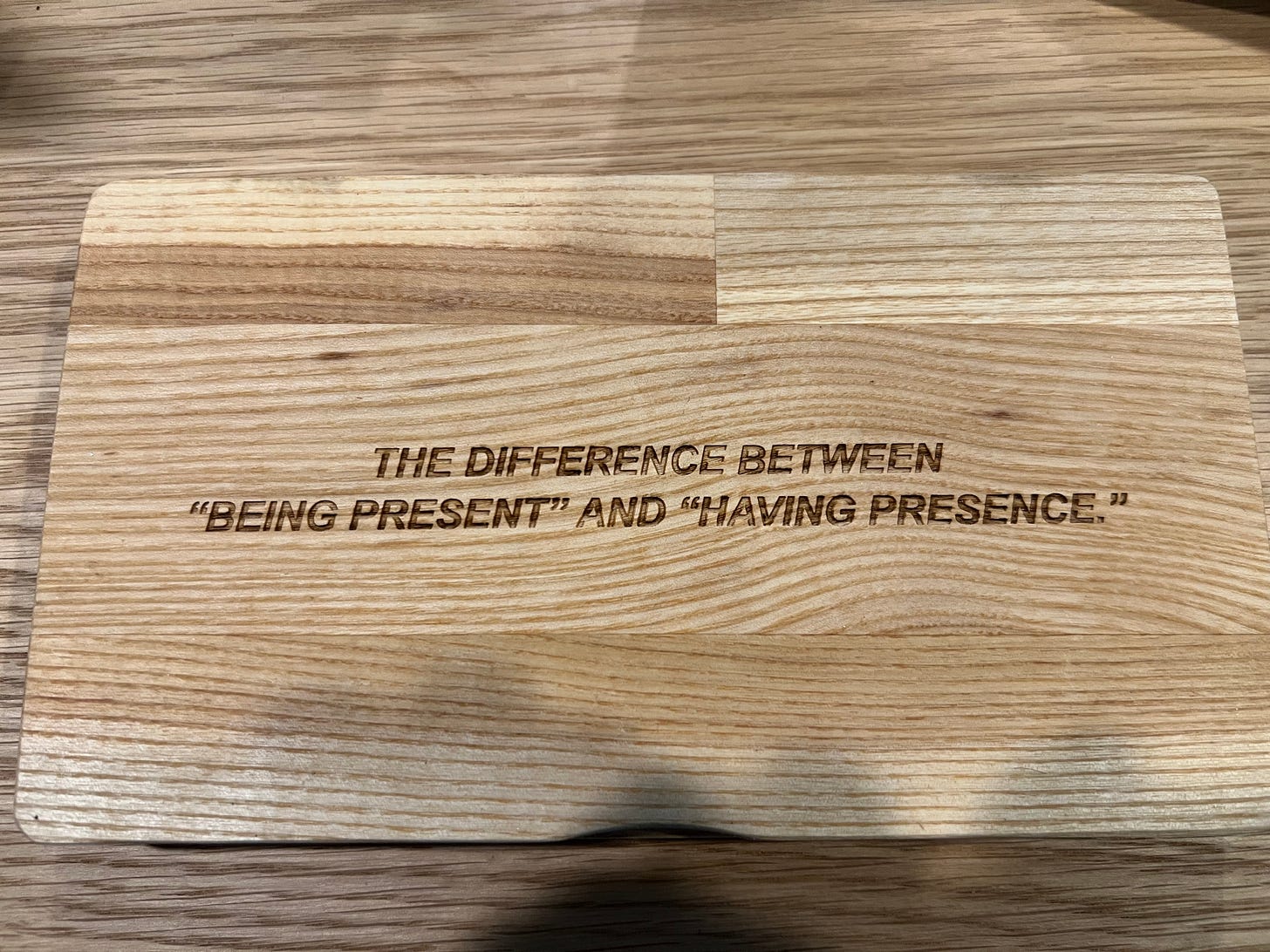 One of the best pieces of advice I gained from Leython Williams (we’ve been friends since 6th grade) was that there’s a “difference between being present and having presence.” (See photo above.) That deeply resonated with me, and now, I see this quotation every time I walk through the door at my house.